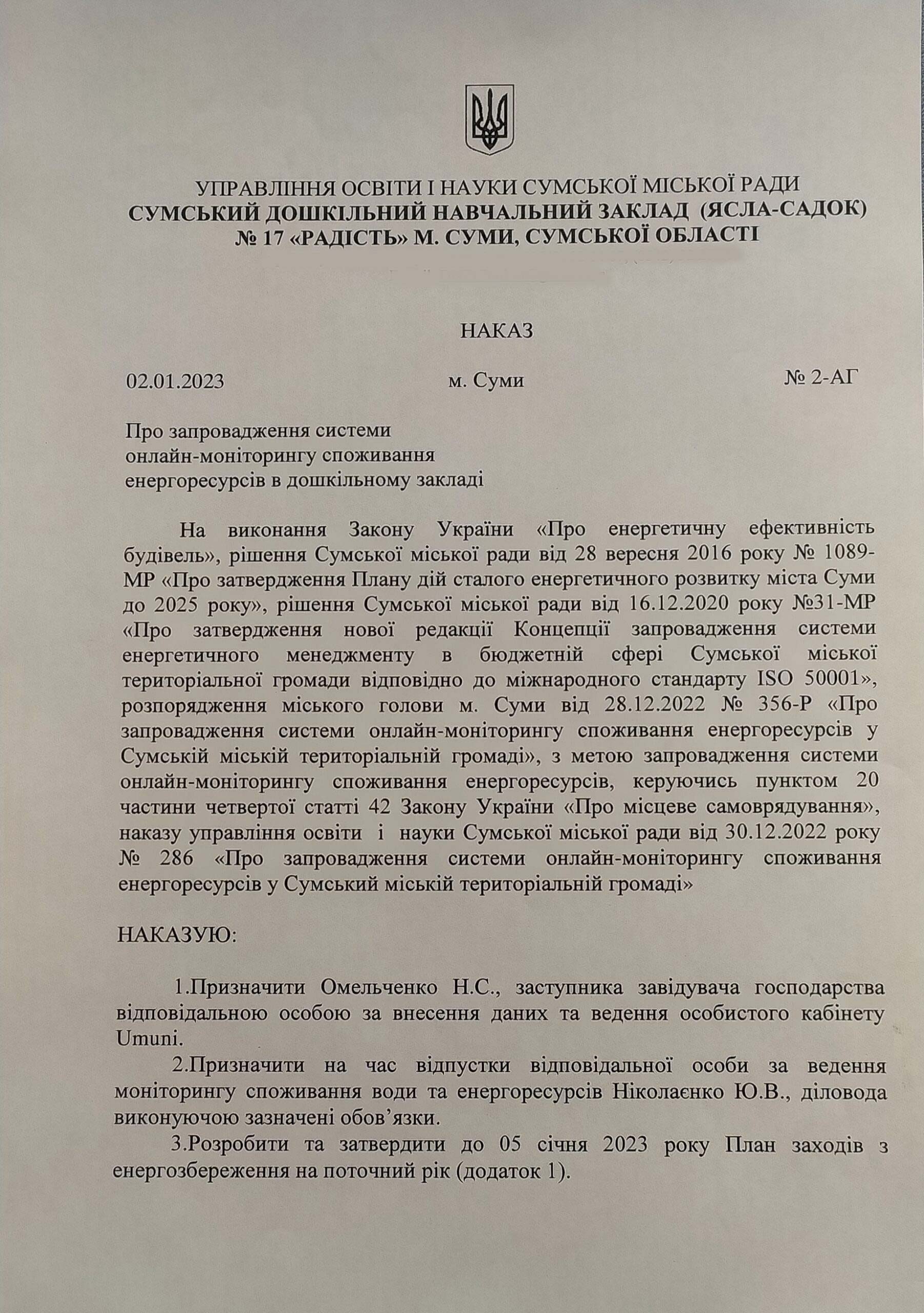 Наказ “Про запровадження системи онлайн-моніторингу споживання енергоресурсів в дошкільному закладі” від dnz | Лют 9, 2023 | Накази